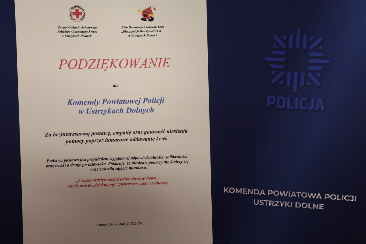 Na ręce Komendanta Powiatowego Policji w Ustrzykach Dolnych mł. insp. Krzysztofa Łopuszańskiego wpłynęło również podziękowanie za aktywne zaangażowanie funkcjonariuszy w działania na rzecz ratowania zdrowia i życia ludzkiego. Wyrazy uznania podkreślały społeczną odpowiedzialność policjantów oraz ich gotowość do niesienia pomocy także poza codzienną służbą.
